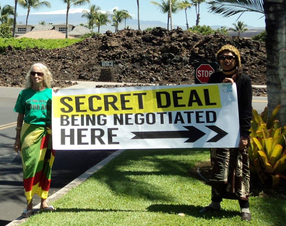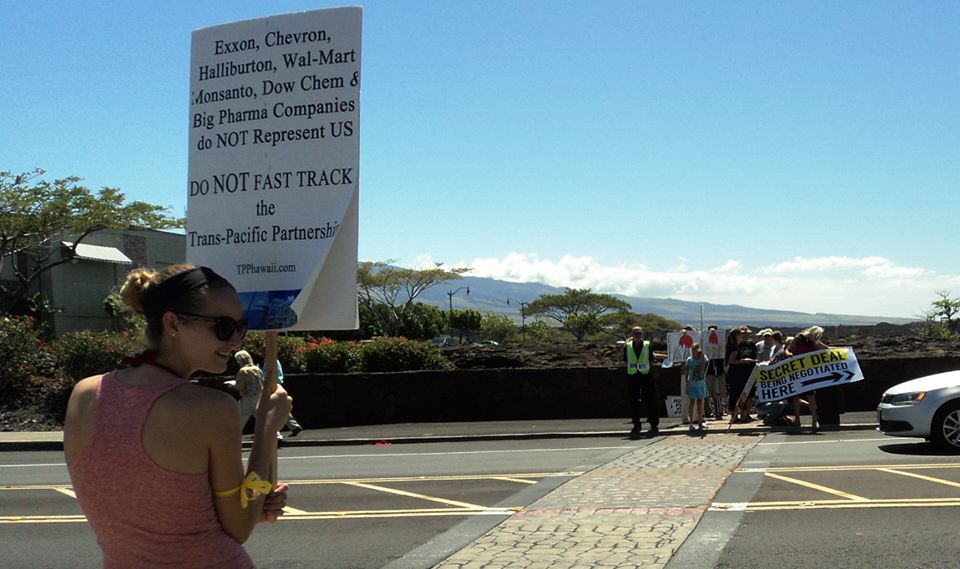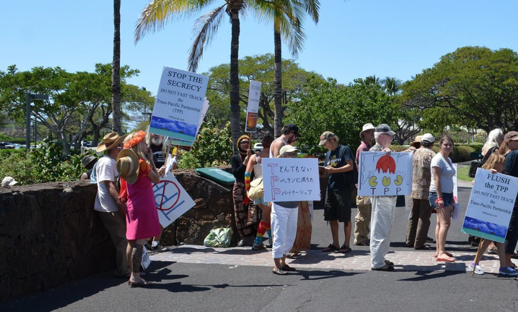 As trade negotiators from throughout the Pacific Rim met at the Waikoloa Beach Marriott Resort & Spa in March 2015 with a goal of pushing the controversial Trans-Pacific Partnership (TPP) to completion, residents from across the Big Island and beyond gathered outside for a protest deriding the proposed pact as a “back-room deal for the one percent.”